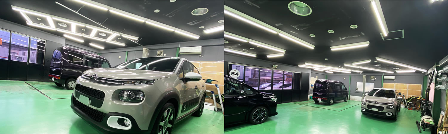 当店では蛍光灯を除く3種類の光源の異なる特殊照明を天井用と側面用にそれぞれ完備することにより、微細なキズの存在も逃しません。完璧なまでに塗装面を把握することにより、 初めて徹底した下地処理が可能になります。店舗内の作業用照明全てを高輝度LED照明化しております。